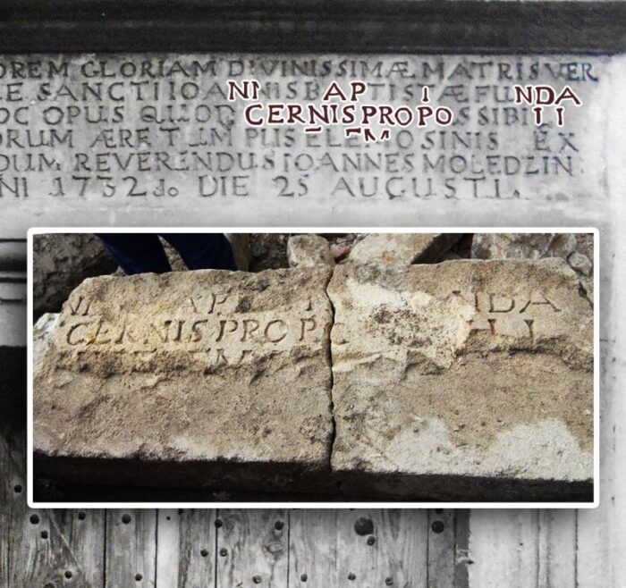 Як з’ясувалося, маємо абсолютно повний збіг понівеченого фрагменту з написом із фундаційною таблицею з костелу св.Анни. Тобто як матеріал під дорожній бордюр комуністи колись використали розбиту меморіальну дошку знищеного ними храму.