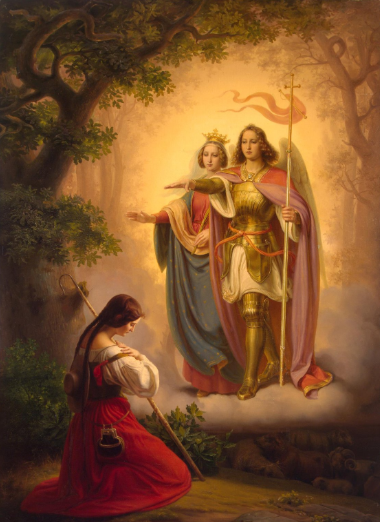 Святий Михаїл вперше об’явився Жанні влітку 1424 або 1425 року, коли дівчина була в саду свого батька. Їй тоді було 12 або 13 років. Архангела супроводжували інші «ангели Неба», а також свята Катерина і свята Маргарита. Михаїл представився словами: «Я — Михаїл, захисник Франції».