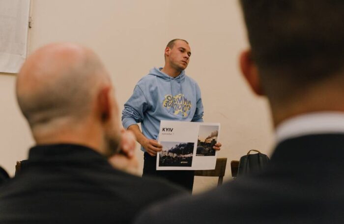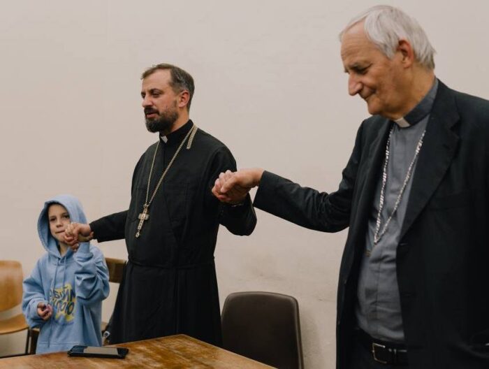 — Сьогодні тут присутні юнаки й дівчата з різних регіонів України: Київщини, Донеччини, Харківщини, Одещини, Луцька — з міст, які зазнали найбільших ударів війни. Вони принесли з собою зображення: фотографії наслідків бомбардувань, що сталися лише за останні два місяці. Школи, театри, церкви, дитячі садки, лікарні, житлові будинки… Я хотів би, щоб ми вислухали їх — їхній досвід, їхні історії. І потім разом принесли це все в молитві, у роздумі.