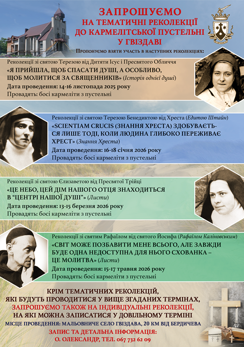Отці кармеліти босі запрошують до Гвіздави й пропонують взяти участь у таких реколекціях: