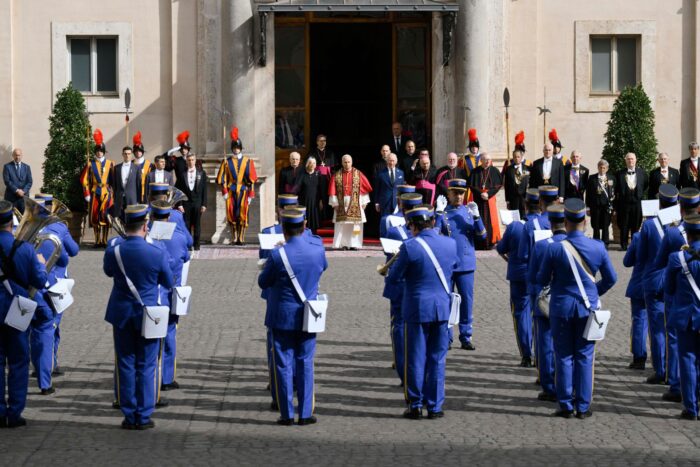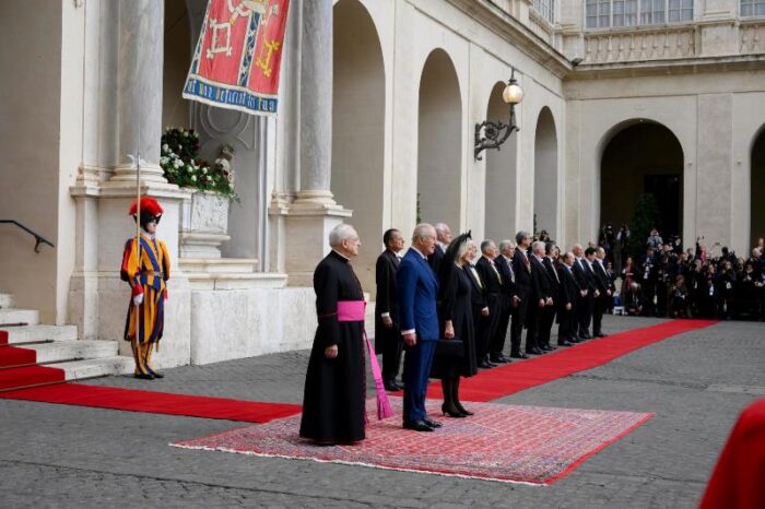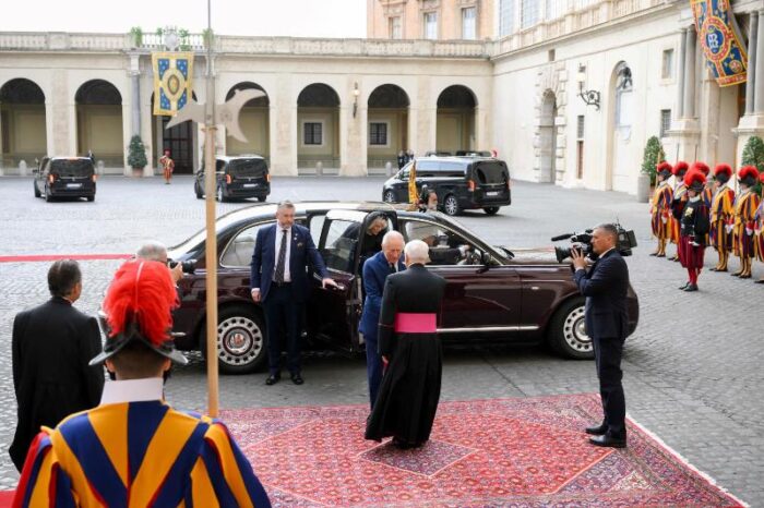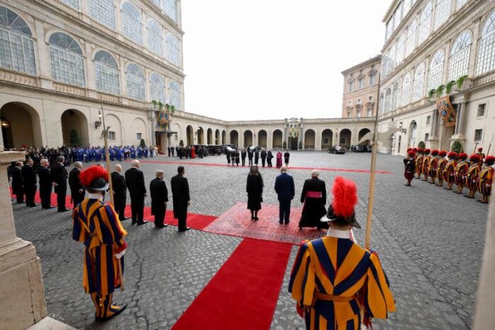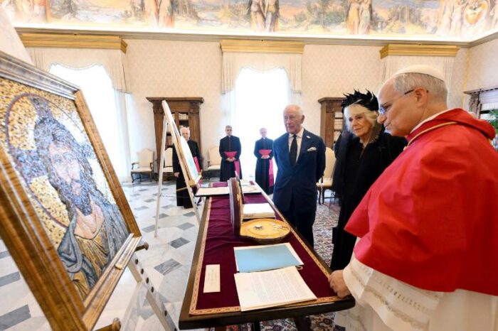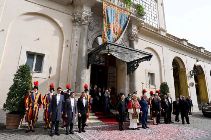 Королівська пара прибула до Ватикану о 10:50. Їх зустріли на внутрішньому подвірʼї св.Дамазія, згідно з протоколом державних візитів. Після того, як оркестр Жандармерії виконав гімн «God Save the King», у супроводі почесної варти швейцарських гвардійців король Чарльз III і королева Камілла увійшли до Апостольського палацу. Відбулась приватна аудієнція Папи для монархів, а потім кілька паралельних зустрічей: королева Камілла відвідала Паолінську каплицю, а король Чарльз провів переговори в Державному секретаріаті з кардиналом П’єтро Пароліном.