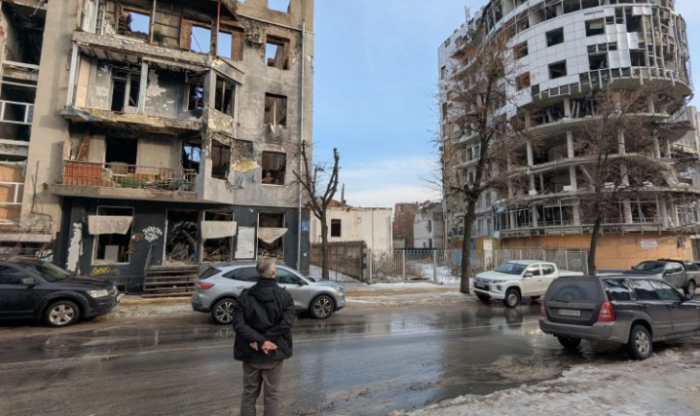 На тлі зруйнованих будинків у Харкові. Фото: Тезе